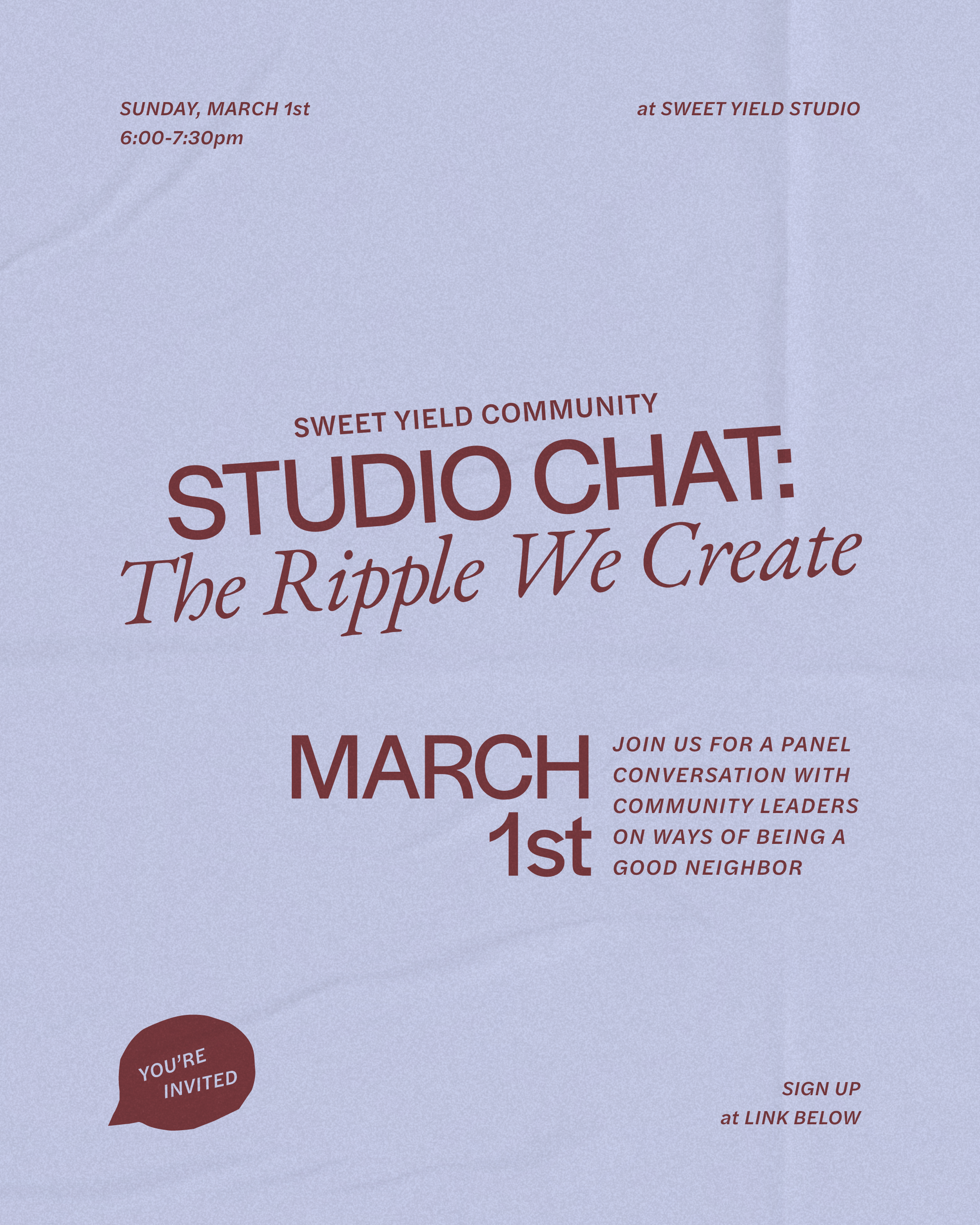 Join us for a panel conversation with community leaders exploring the impact we create in our daily interactions and the ways we show up for our neighbors. Moderated by Sweet Yield Community. Panelists: Kori Hall, Sara Jacobson, Aley Cristelli, Zarifa Housini, Sandra Konda.