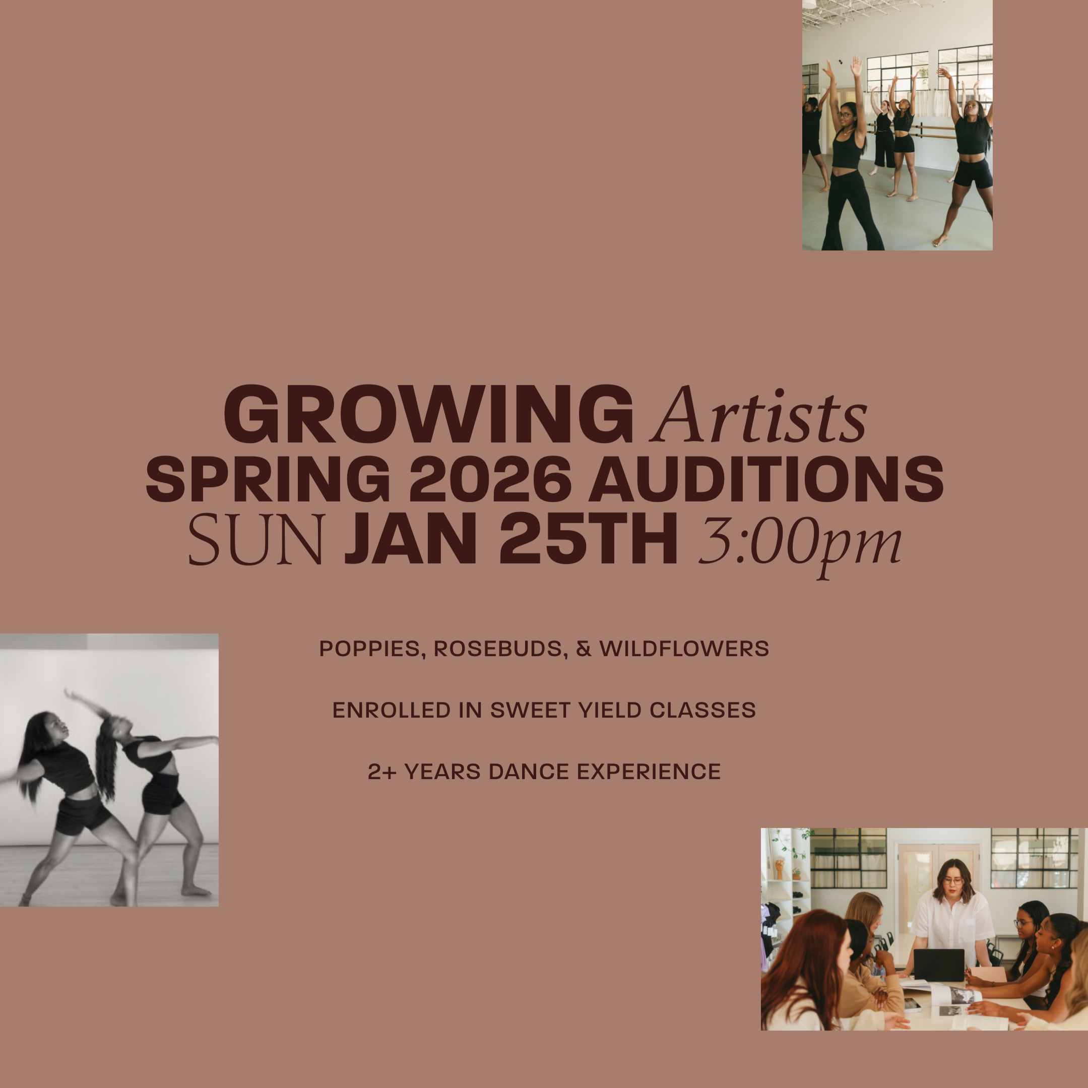 -Enrollment in at least 1 Sweet Yield class in addition to Growing Artists. Dancers must have a strong foundation of dance technique and ongoing training in multiple styles.